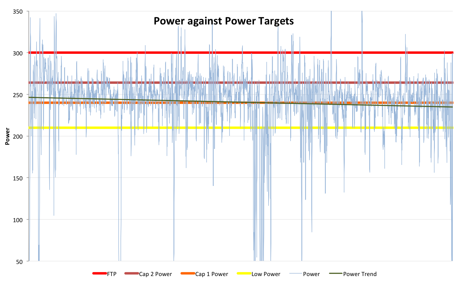 Another text book example of pacing, average power remains consistent across the entire day. There is a little more variability than in Nick’s race, but the difference isn’t huge. What does stand out is the pacing strategy – Nick races at 75% of his FTP, Roger has raced around 80% of his FTP every time. I raised Cap 1 in the chart to reflect this intentionally harder effort.
