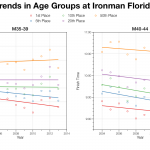 Clearly the fitter, better prepared athletes are going faster across the board. If you want to win your age group you need to be strong in all three sports. It’s also clear that swimming is the discipline where athletes vary the most in ability, you get slower swimmers with fast overall times and some fast swimmers with slower overall times. I know many age groupers will be relieved to learn that their swim is a poor indicator of potential race performance, but before they get too excited, I have more to add in a moment. Otherwise the faster you can bike and the faster you can run, then the faster you will go. A good reason to train hard.