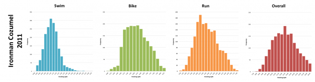 The fourth running of Ironman Cozumel appears to be typical of the course. In fact the only difference that really stands out is the slower swim distribution when compared with the previous three years in the charts below. Outside of that the shapes of the varying finisher distributions vary subtly and less significantly. Perhaps 2012 was slightly slower, but I’d not be willing to commit myself to this.