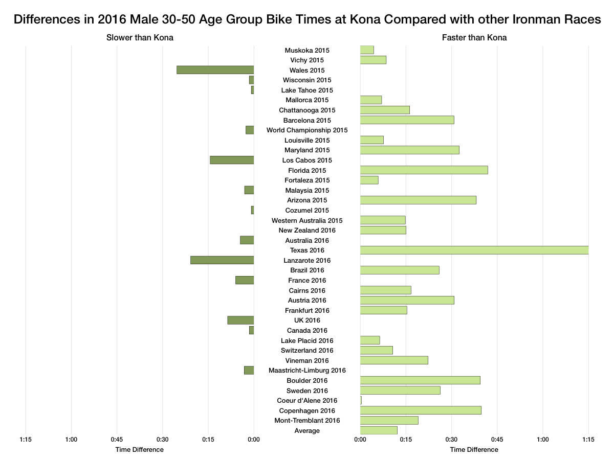 The adjustments to this year’s swim, apparently a correction of the course, had a clear impact on swim times. Roughly a quarter of races had slower swims than Kona, the difference not much more than the shift we saw in Kona’s swim times this year. In my previous analysis only one or two events had slower swims than Kona.