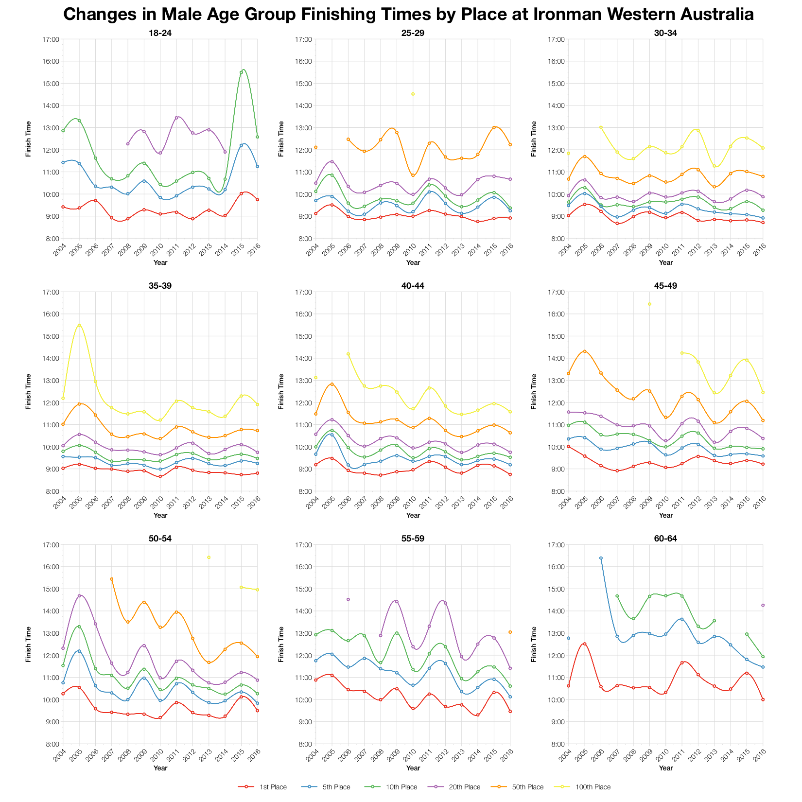 Overall it looks like conditions were quite fair and enabled some fast times at the front of the race. This was balanced out across the field though which kept the medians in line with previous results. I’d put 2016 as a faster than average race in Busselton.