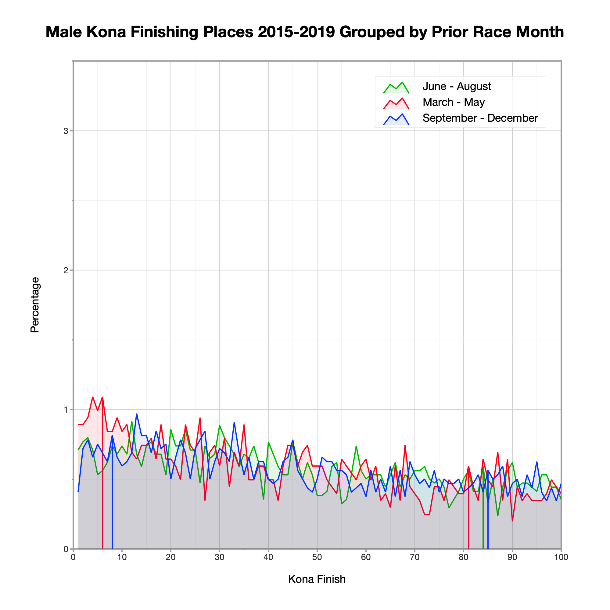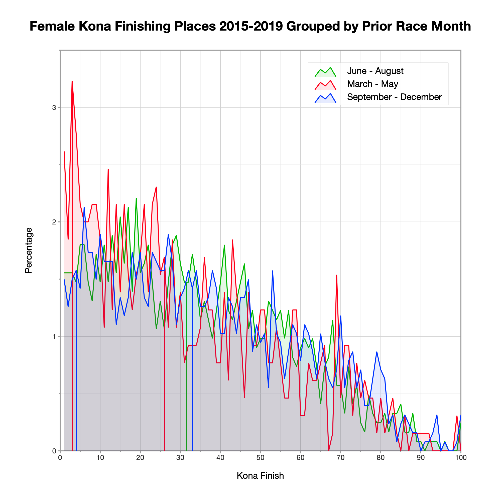 It’s been a journey. I’ve gone from believing there was no advantage to qualifying while Kona was happening to thinking there might be a small advantage for women, to thinking it’s so small that it’s not worth considering. While there was evidence that women’s times were slower in Kona for those who race in the early qualifying season, and more of the top 10 at Kona come from the March to May period, it’s not a huge difference. Men showed even less difference in times for the three groups, placings followed a similar trend.