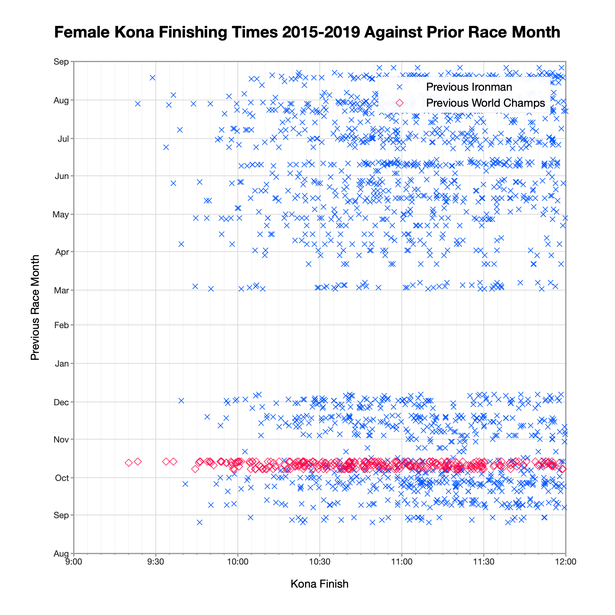 This graph includes results from any athletes who completed the World Champs during the qualifying season (in red). When we look at the lower half of the graph we can reasonably assume that most of those red diamonds are not blue crosses in that region. With women making up a smaller proportion of total Ironman numbers it’s not unreasonable that some of the fastest women aren’t racing elsewhere in that period, but there’s not a huge difference in the scatter of those early races from those higher up in the chart.