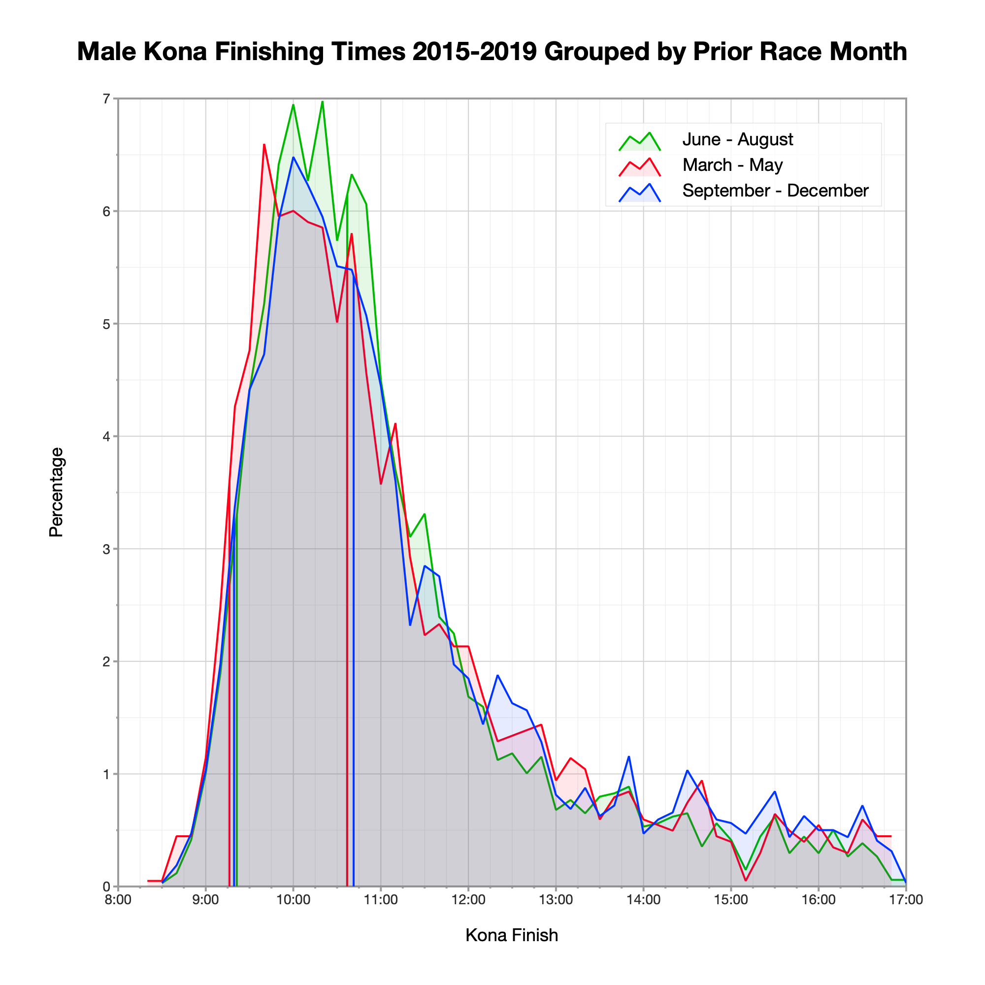 The chart above plots the distribution of age group male finishing times in Kona for 3 different groups. Those who raced early-season (late August to December), mid-season (March to May) and late-season (June to early August). Along with the distribution there are two sets of lines indicating the top 5% and the median for each group. In this instance I’ve considered Kona between 2015 and 2019 for consistency. Recent years with two championship locations and the impact of Covid make the data less clear.