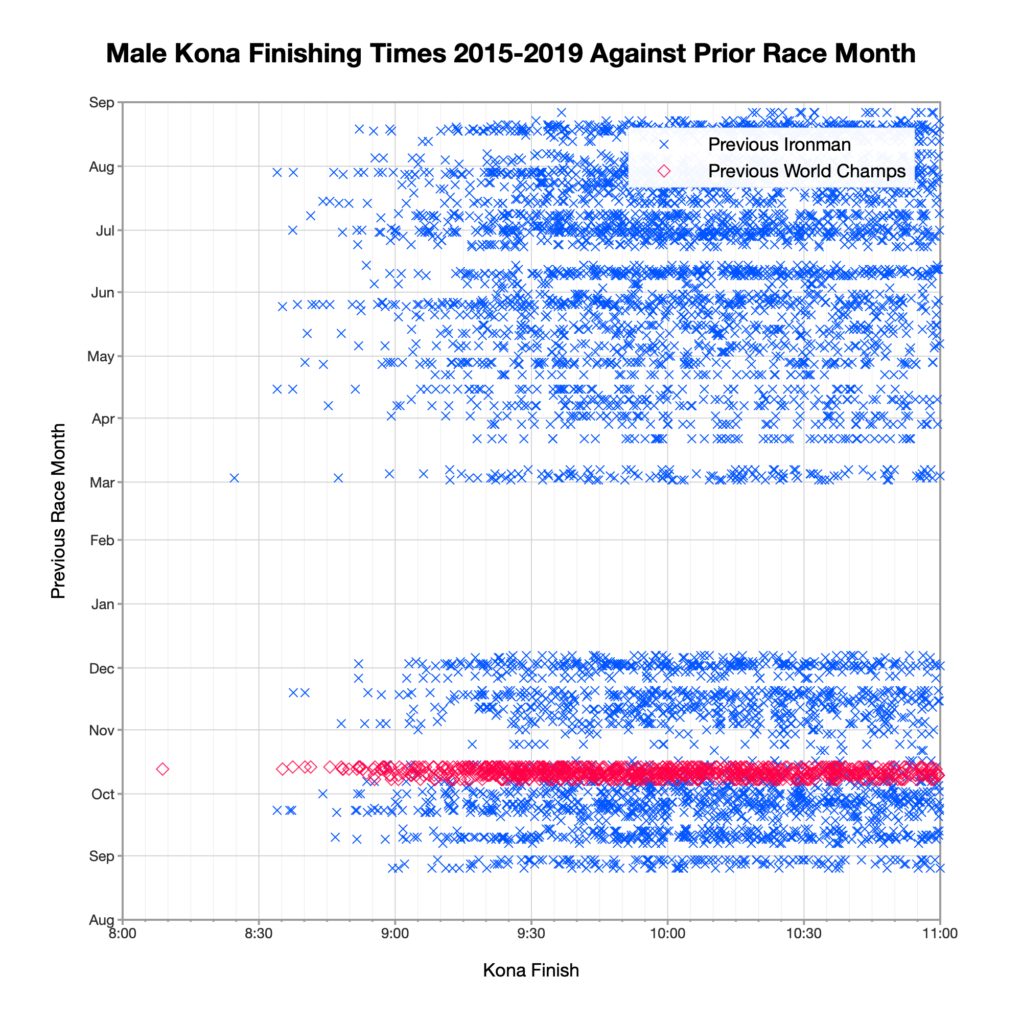 Many more men race Ironman, so the equivalent chart for age group men shows a much denser scatter plot. Again, we can expect that the majority of athletes in the red diamonds are not blue crosses in that period. But the greater numbers helps ensure that there are many other athletes equally capable of hitting the same times. As I realised with the women’s chart, this isn’t the most useful way to view the data, at best it gives a sense of how distributed top performers are across the race season.