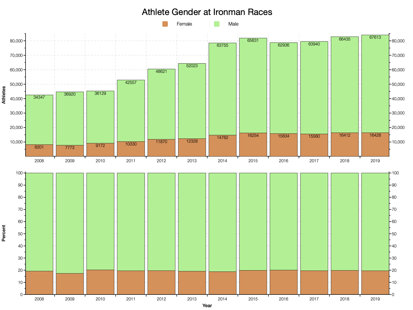 As the overall number of competitors has grown in Ironman the ratio of male-to-female athletes has largely remained unchanged. Both genders have seen growth over the years as the first half of the above chart shows. Throughout this growth numbers have remained at 80:20 male:female with great consistency.